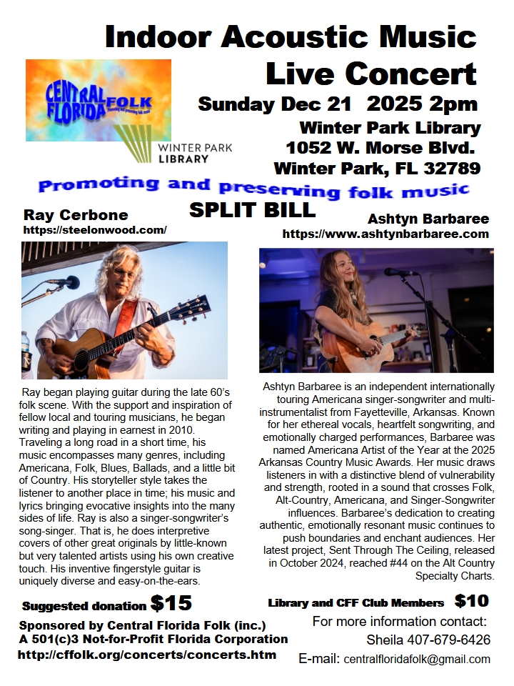 We're always looking for new ways to bring the best in live folk music to you. Always, feel free to contact us at CentralFloridaFolk@gmail.com with your comments, suggestions and ideas. |
